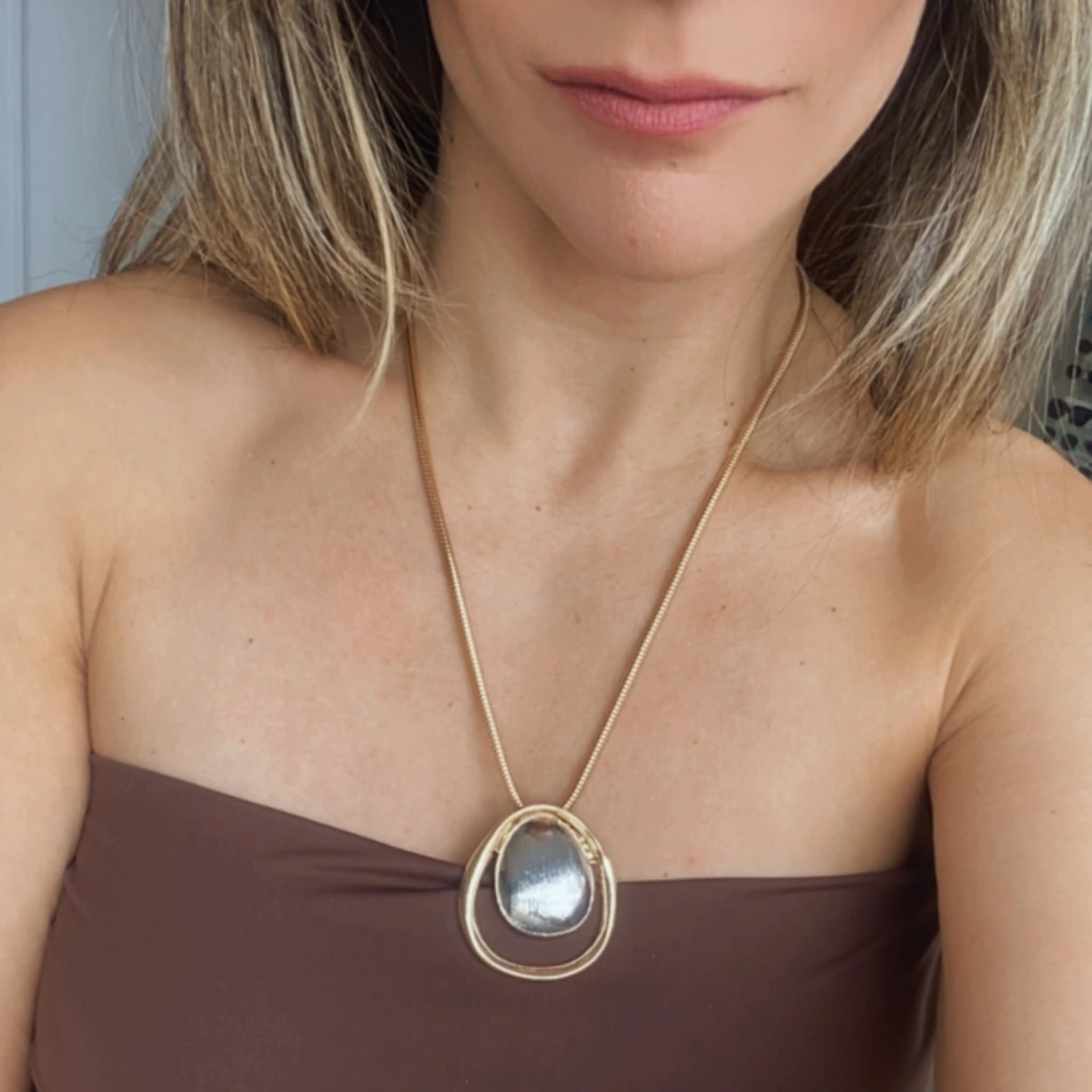 Tamanho: Corrente com 23 cm de comprimento + 7,5 cm de extensor , garantindo um caimento confortável e versátil. Pingente 4,2cm de largura e 4,5 cm de altura com metal em dourado e prateado. Extremamente leve, proporciona conforto ao longo do dia. Feito em bijuteria dourada , possui acabamento refinado e brilho discreto, tornando-se uma peça essencial para qualquer ocasião.