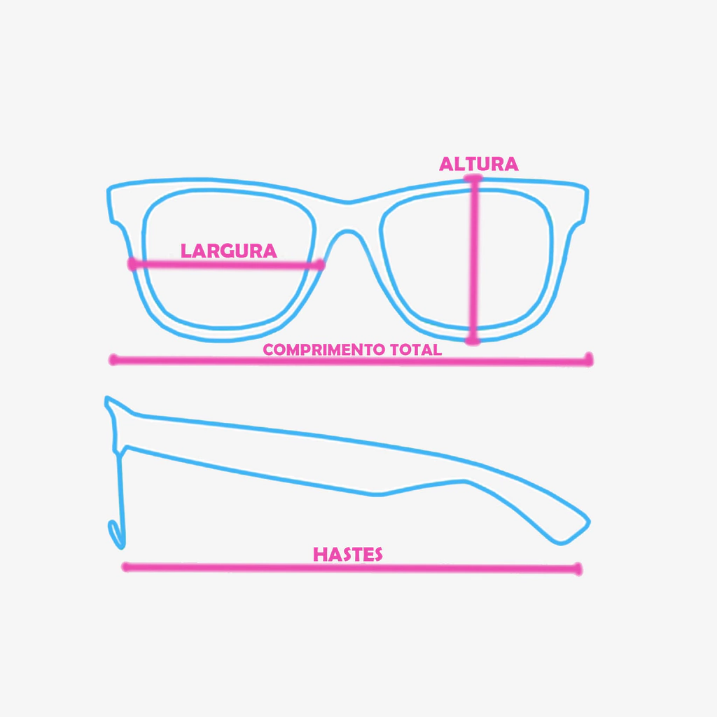 Medidas das lentes: 5,5 cm de largura, 5,0 cm de altura, 14,5 cm de comprimento total da frente