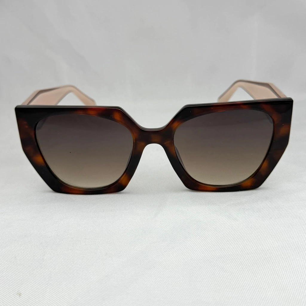 Descrição do produto: Armação em acetato na cor tartaruga e hastes na cor nude. Lentes feitas em policarbonato na cor marrom com efeito degradê.
