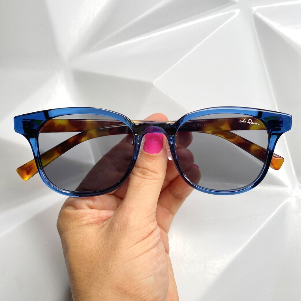 Armação em acetato transparente na cor azul e hastes em tartaruga. Lentes feitas em policarbonato na cor preta.