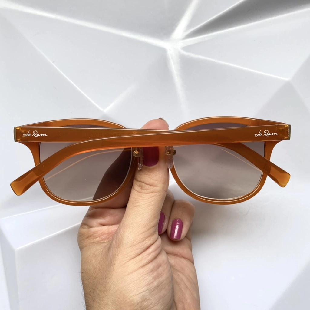 Descrição do produto: Armação em acetato na cor caramelo. Lentes feitas em policarbonato na cor marrom e pequeno detalhe em dourado nas plaquetas.