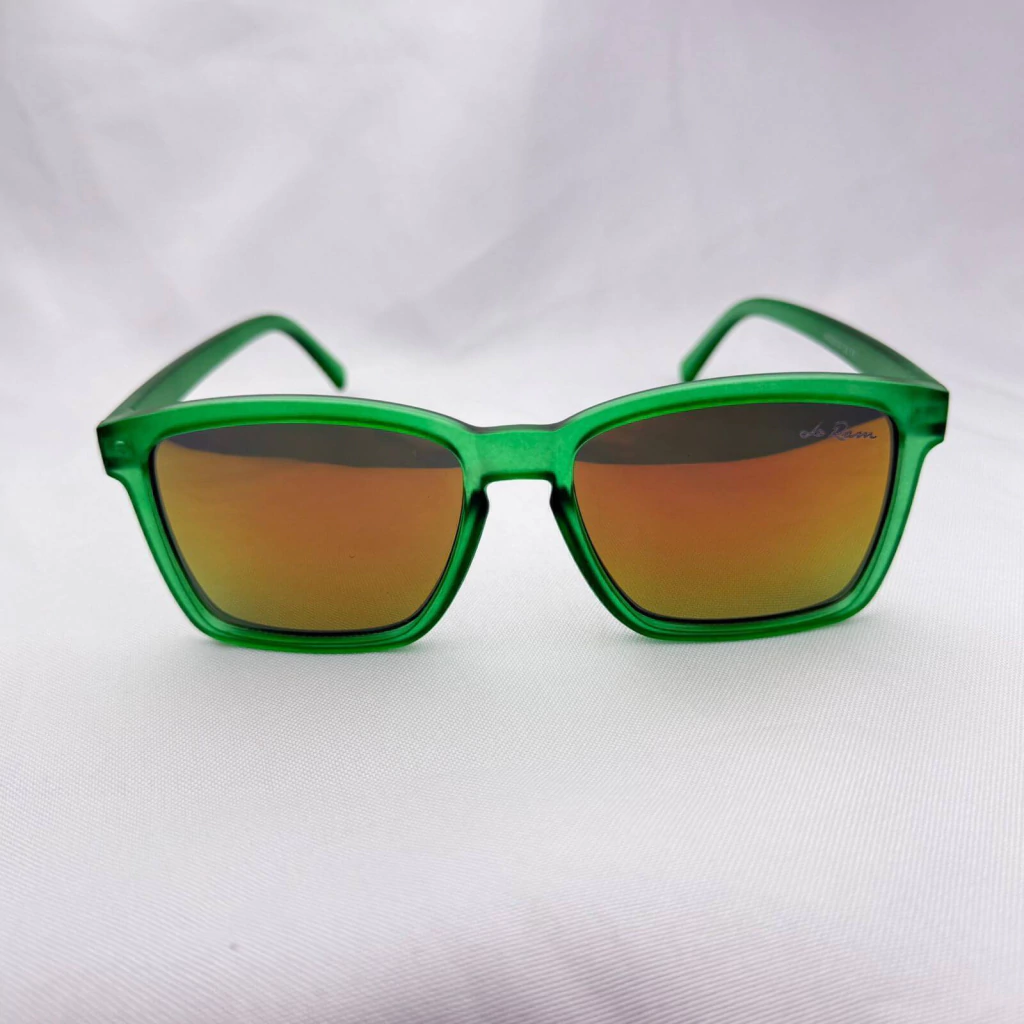 Armação em acetato na cor verde fosco, lentes feitas em policarbonato na cor vermelho totalmente espelhadas