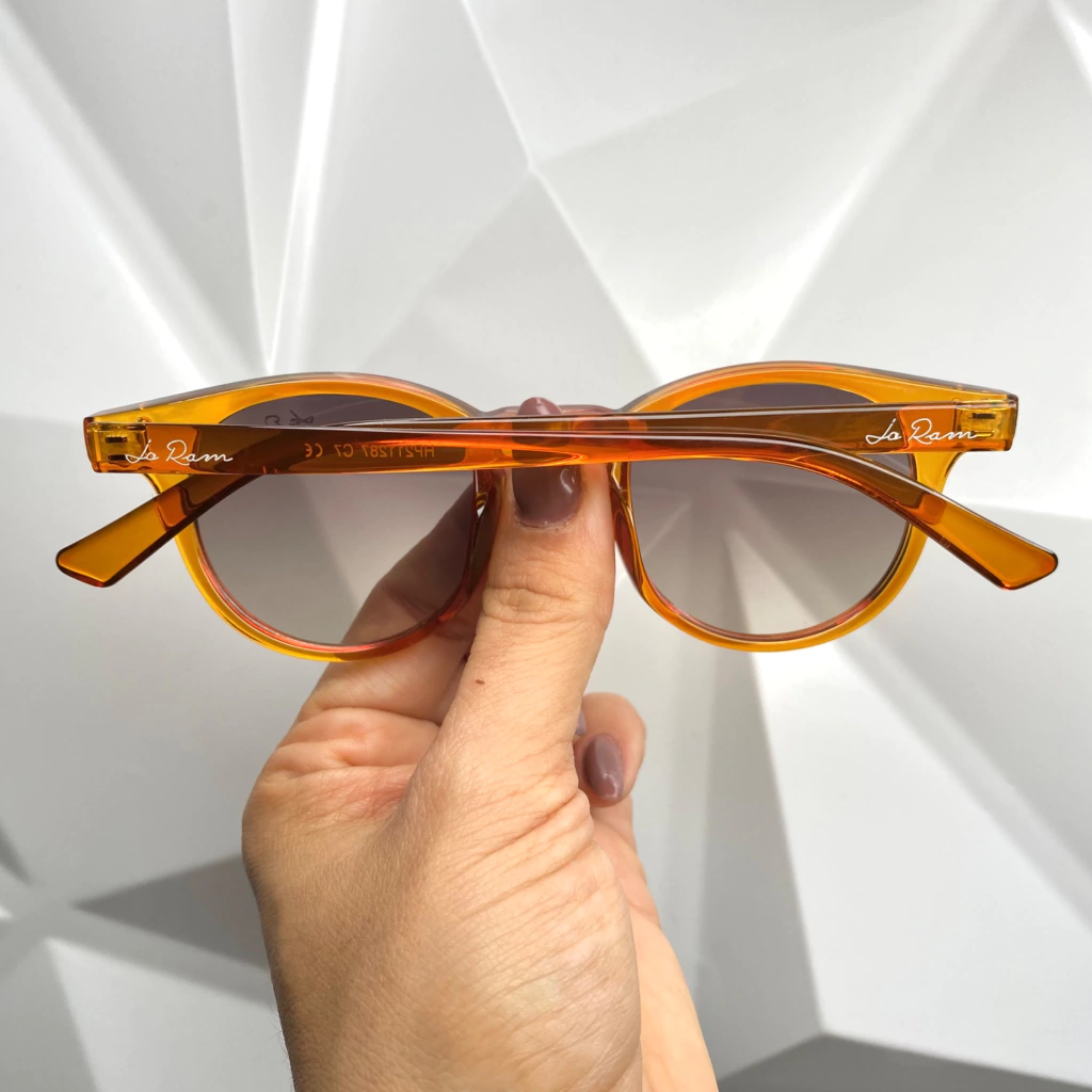 Armação feita em acetato transparente na cor caramelo com detalhes de dois pontinhos em cada lado em metal na cor dourada, lentes feitas em policarbonato na cor marrom com efeito degradê.