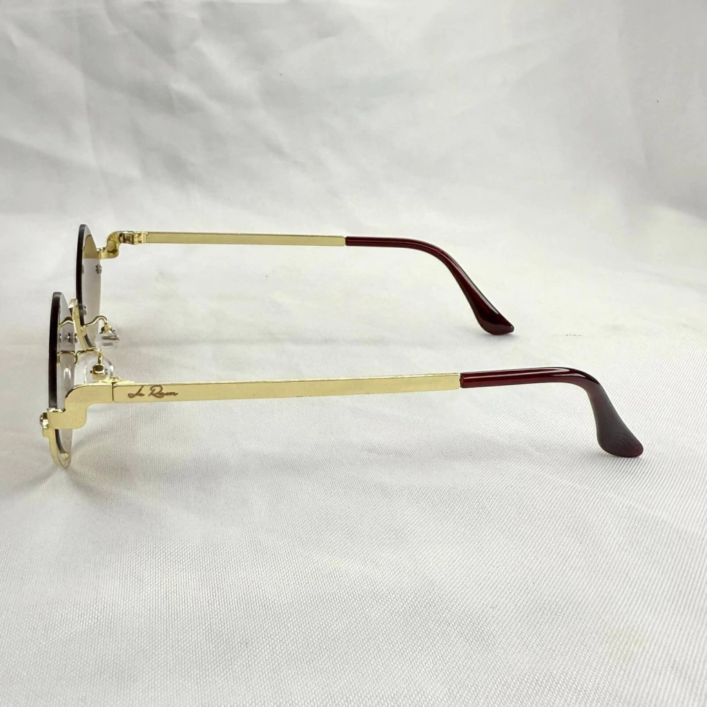 Armação em metal na cor dourada. Lentes feitas em policarbonato na cor marrom com efeito degradê.