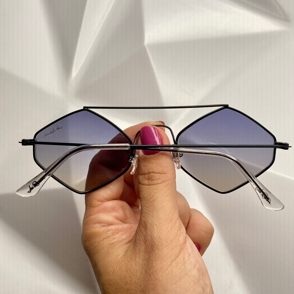 Descrição do produto: Armação feita em metal na cor preta. Lentes feitas em policarbonato na cor preta com efeito degradê para o azul.