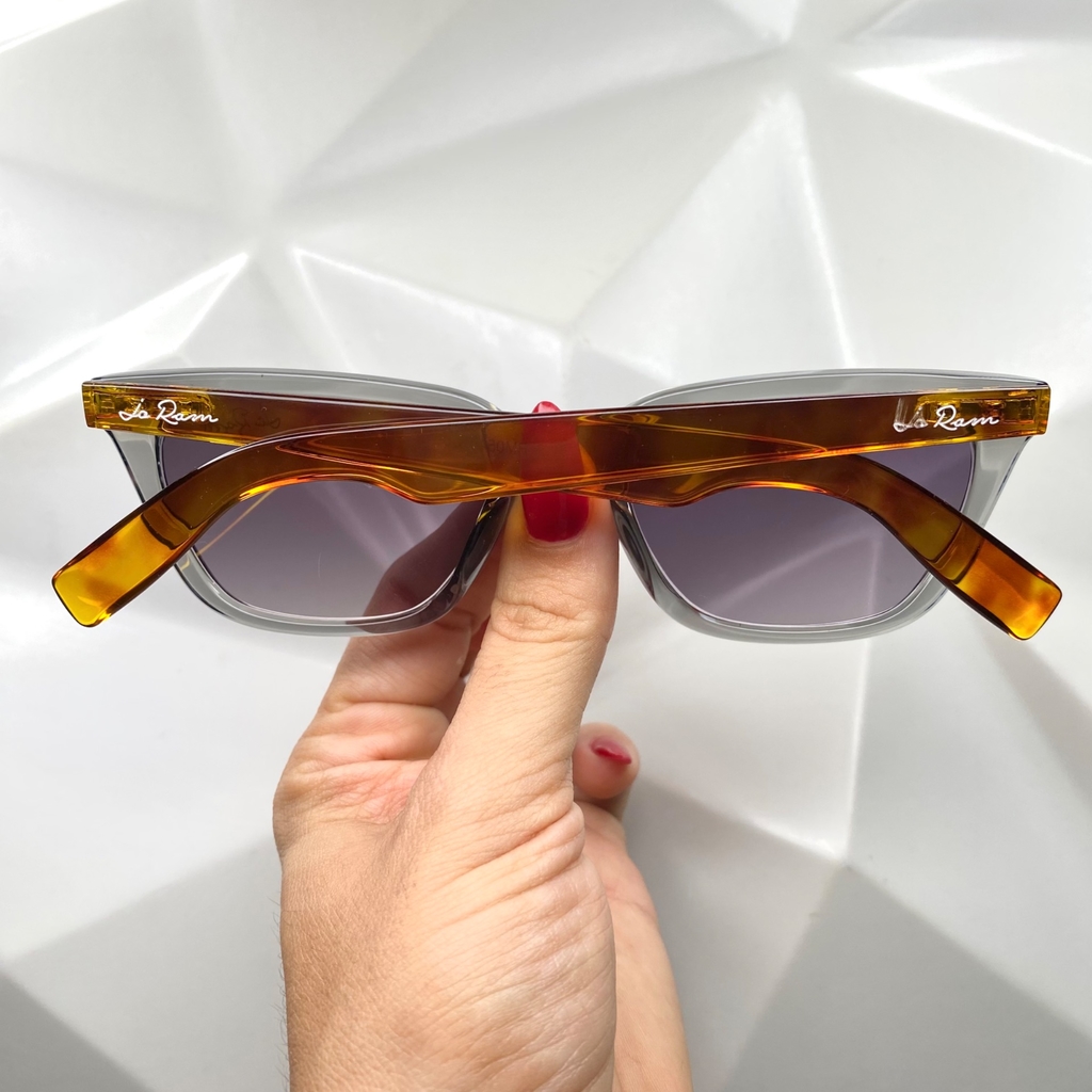 Armação feita em acetato transparente na cor cinza com hastes feitas em tartaruga. Lentes feitas em policarbonato também na cor preta