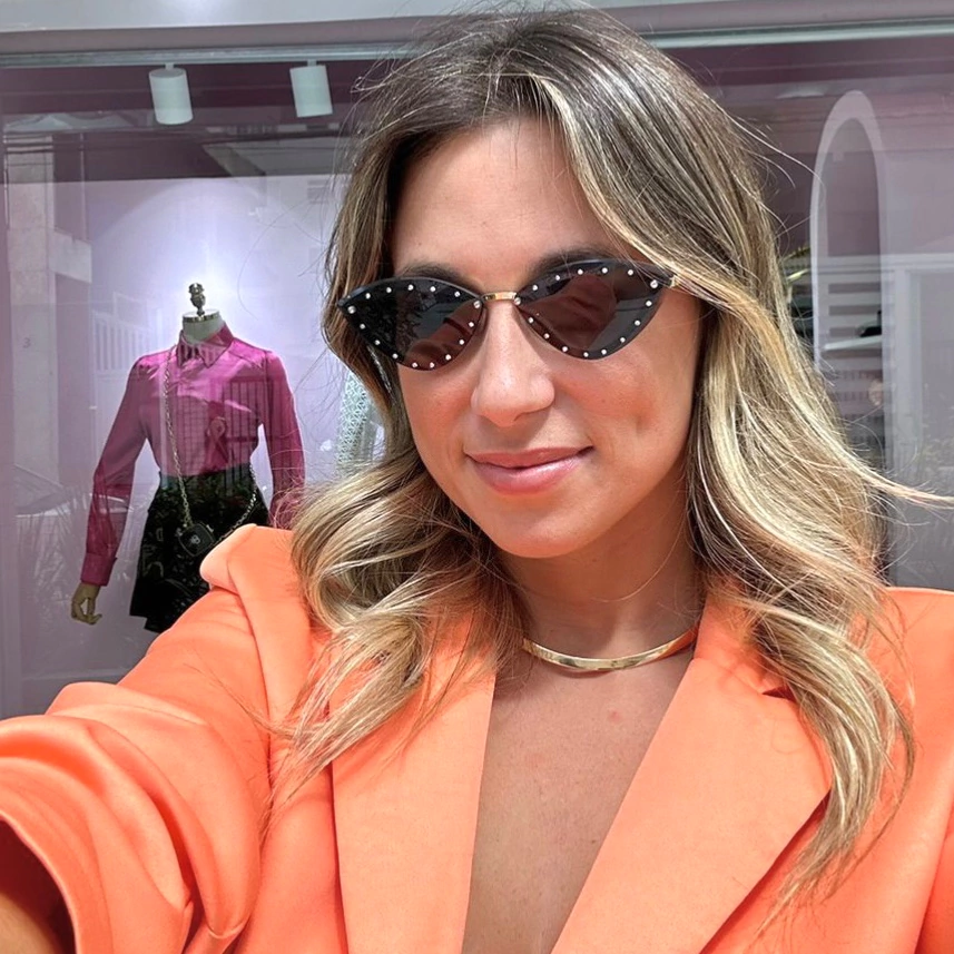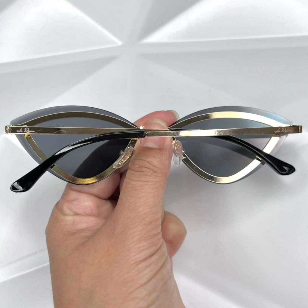 Armação feita em metal na cor dourada e com pequenos cristais como detalhes nas lentes que são feitas em policarbonato na cor preta.