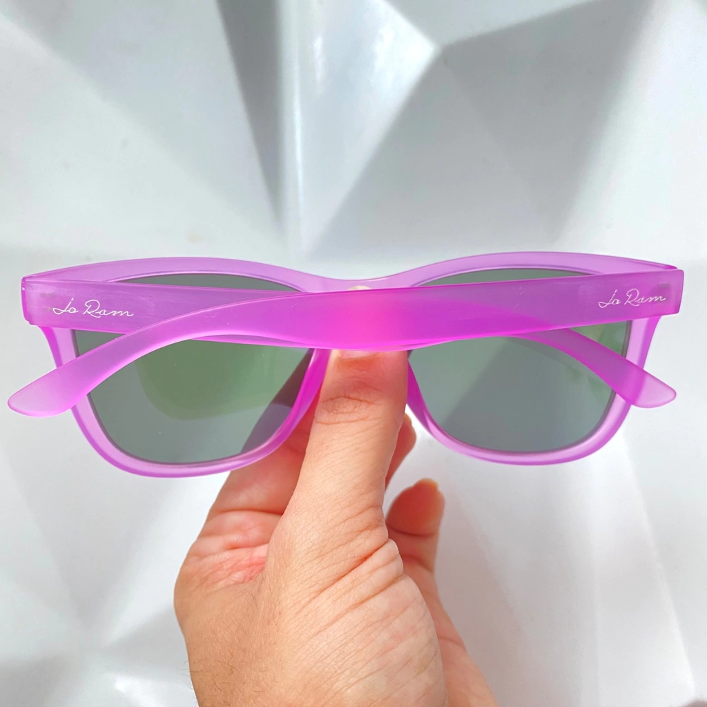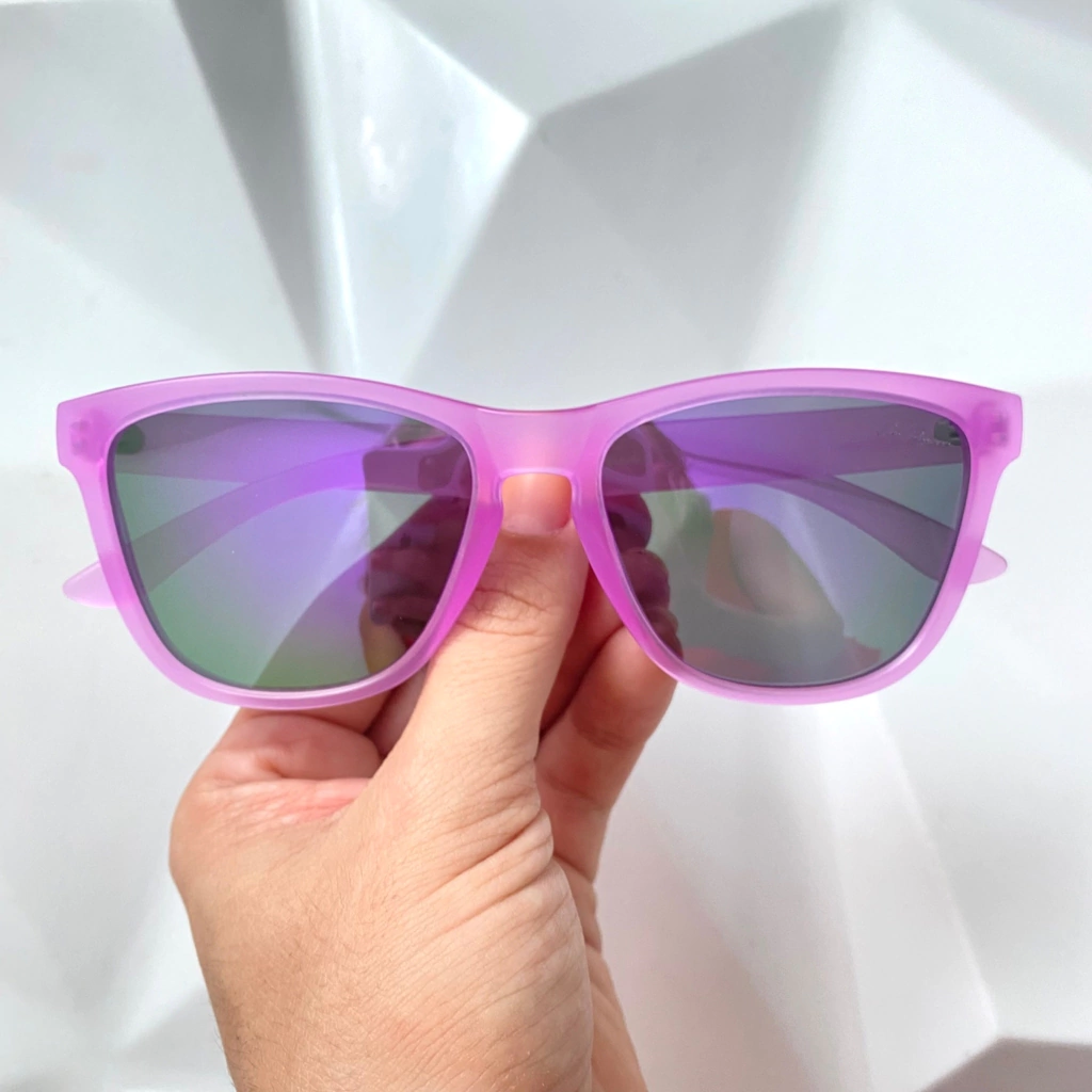 Descrição do produto: Armação feita em acetato lilás fosco. Lentes polarizadas, feitas em policarbonato na cor lilás espelhado.