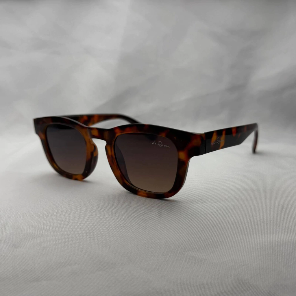 Armação em acetato na cor tartaruga e lentes feitas em policarbonato na cor marrom.