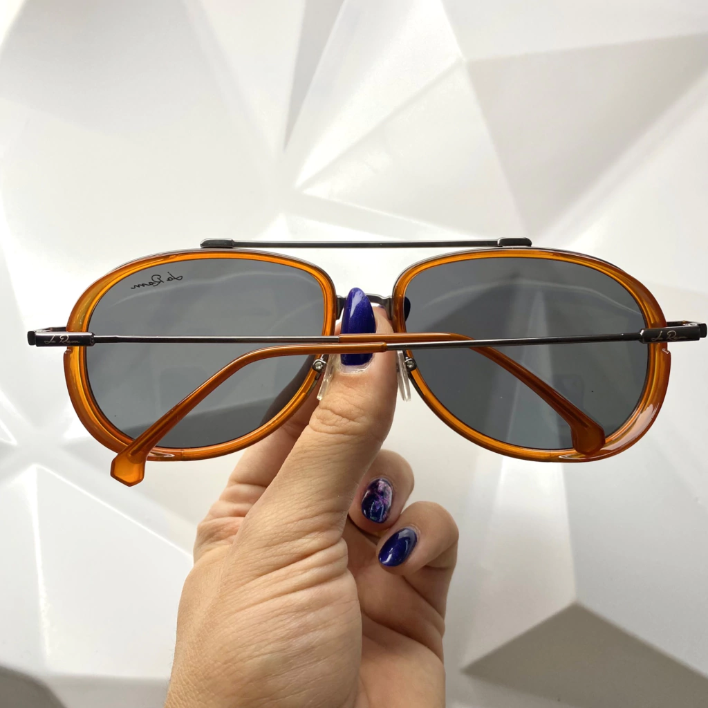 Armação feita em metal na cor chumbo, na parte da frente em volta da lente em acetato na cor caramelo. Lentes polarizadas feitas em policarbonato na cor preta.