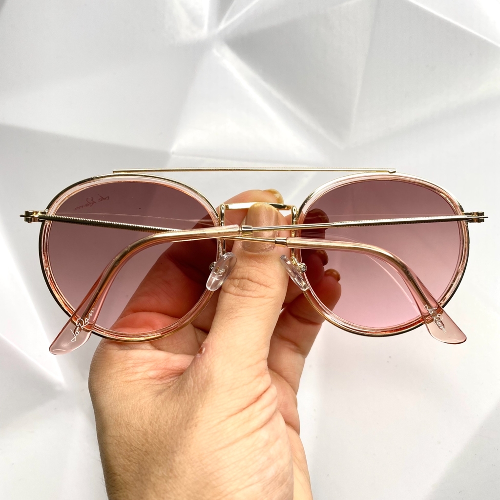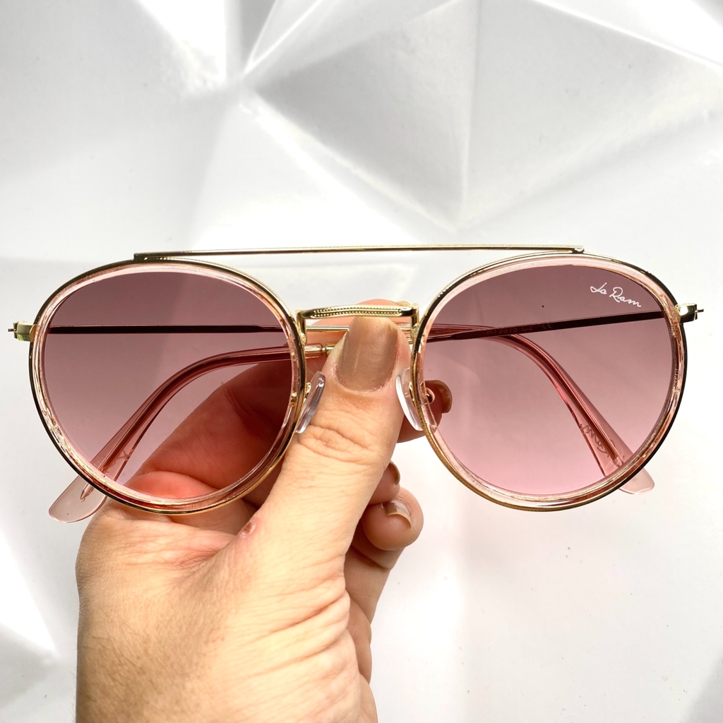 Descrição do produto: Armação feita em metal na cor dourada com detalhe em acetato transparente na cor rosa. Lentes feitas em policarbonato na cor rose com efeito degradê.