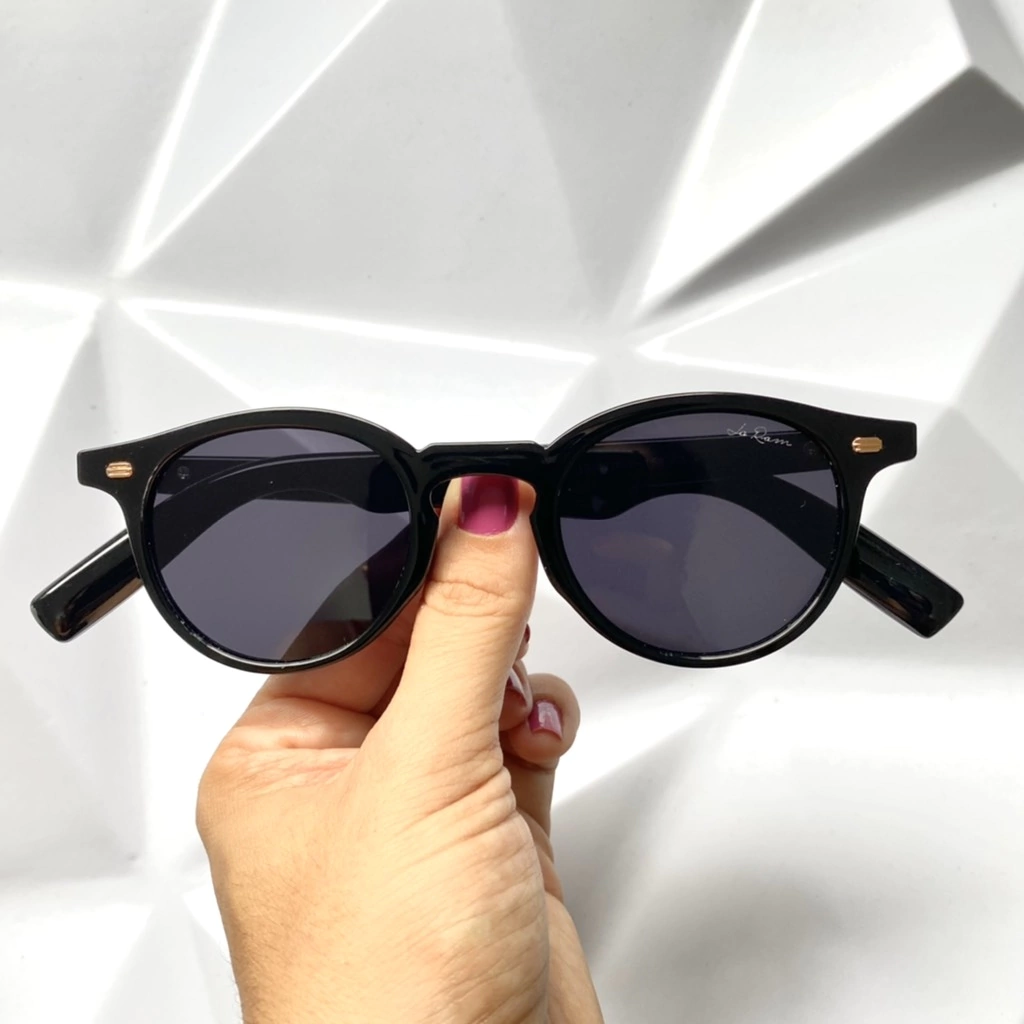 Descrição do produto: Armação em acetato na cor preta. Lentes feitas em policarbonato também na cor preta e pequenos detalhes em metal dourado na frente e na haste conforme a foto.
