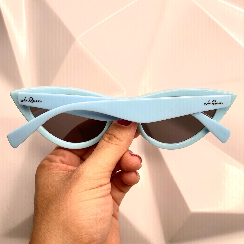 Descrição do produto: Armação e hastes em acetato na cor azul bebe, lentes feitas em policarbonato na cor prata totalmente espelhadas.