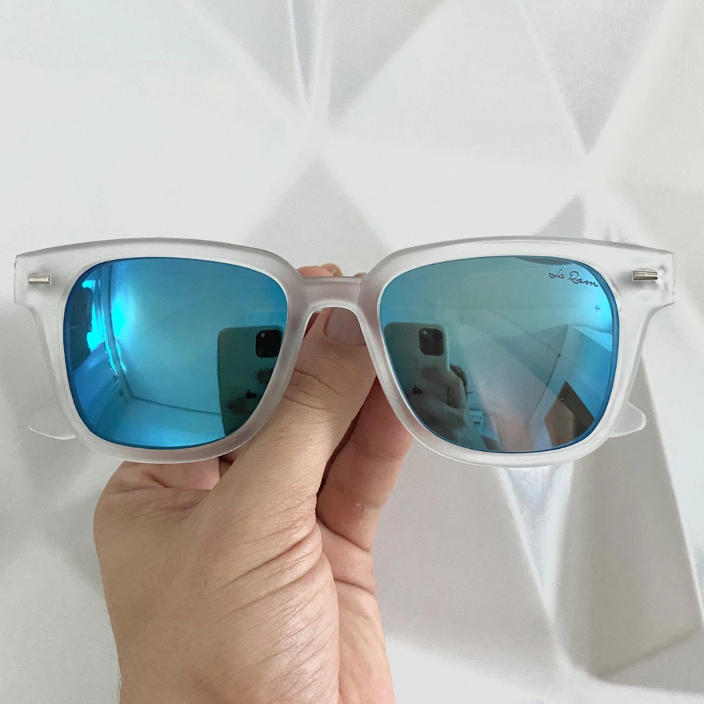 Descrição do produto: Armação em feita em acetato fosco transparente. Lentes em policarbonato na cor azul totalmente espelhadas