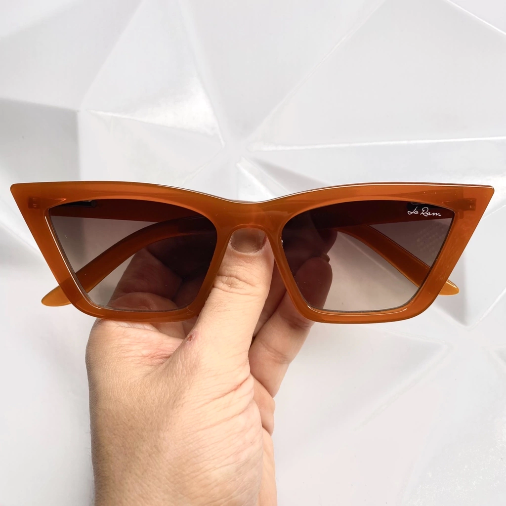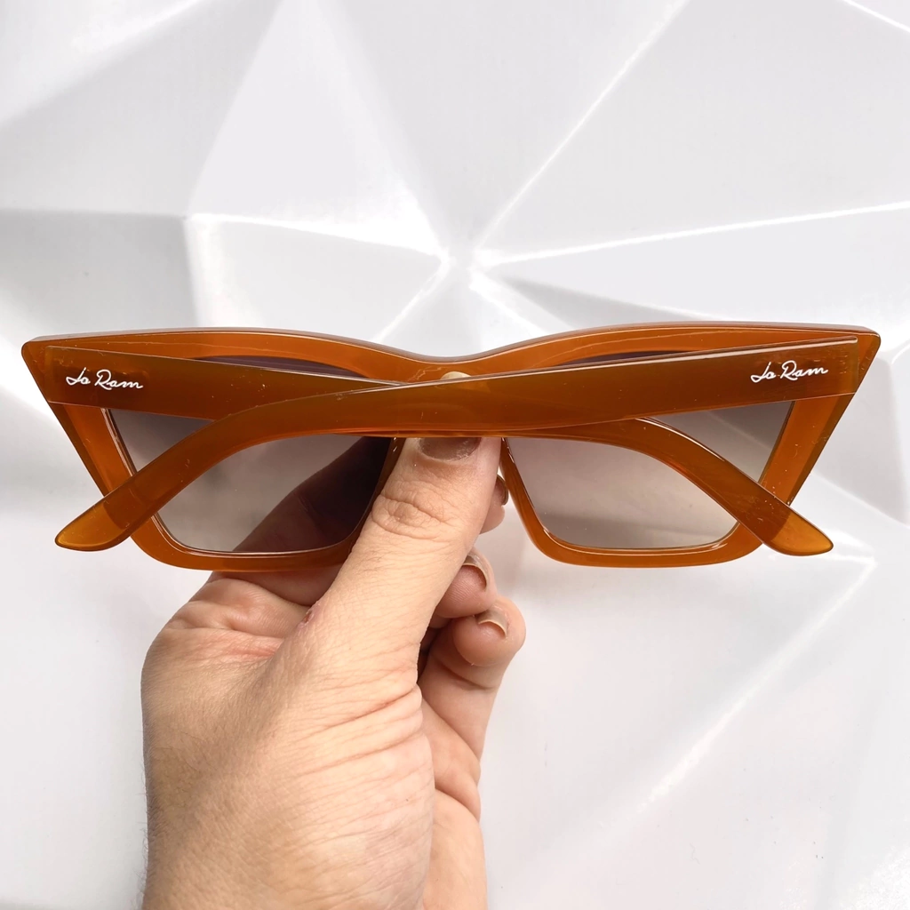 Armação feita em acetato na cor caramelo. Lentes feitas em policarbonato na cor marrom.