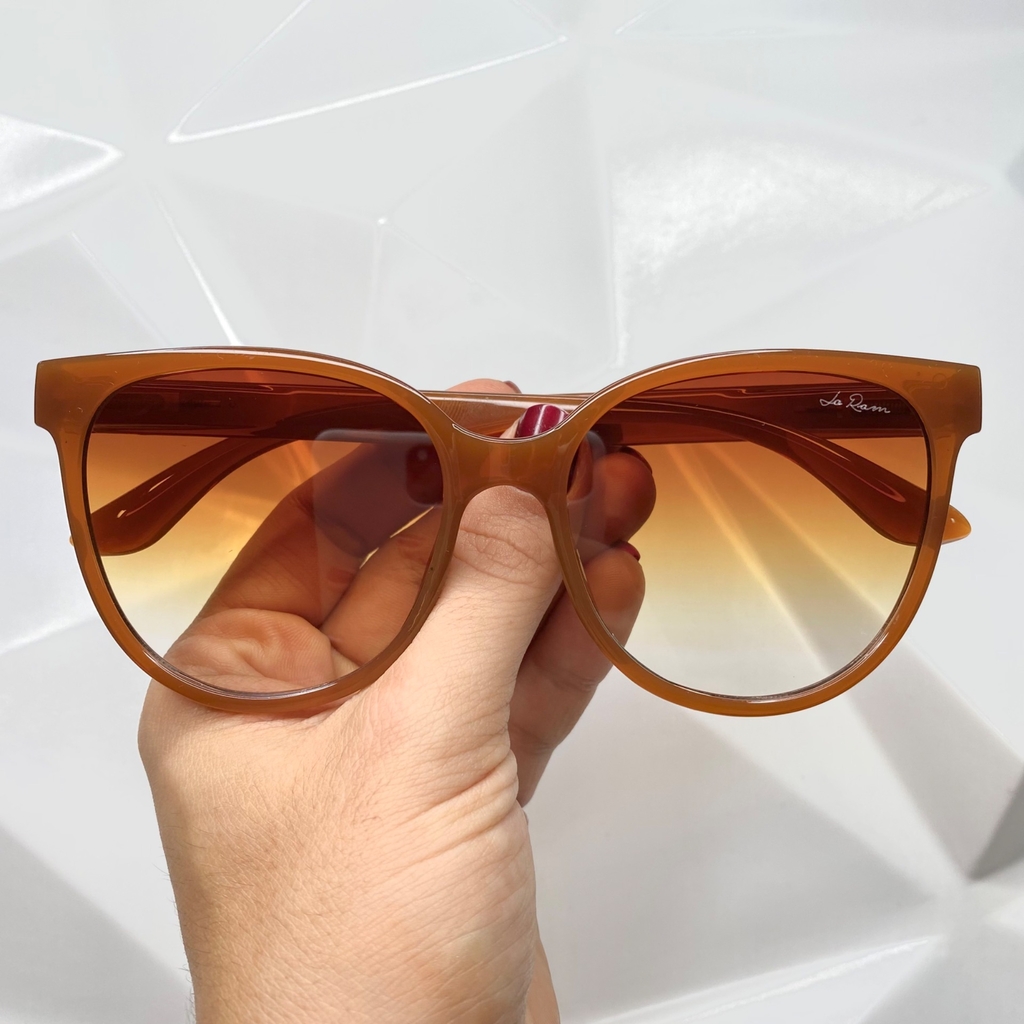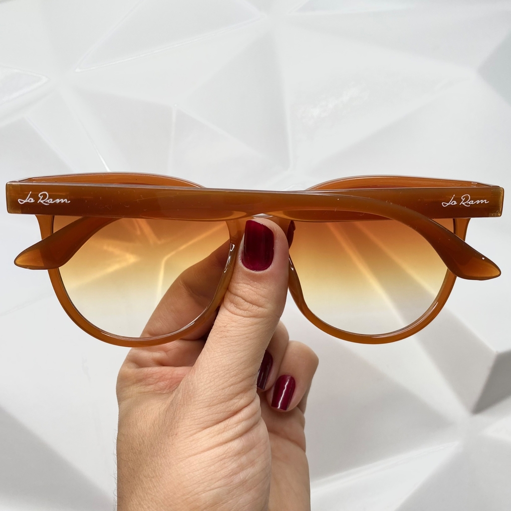 Descrição do produto: Armação toda feita em acetato na cor caramelo, lentes feitas em policarbonato na cor marrom com efeito degradê.